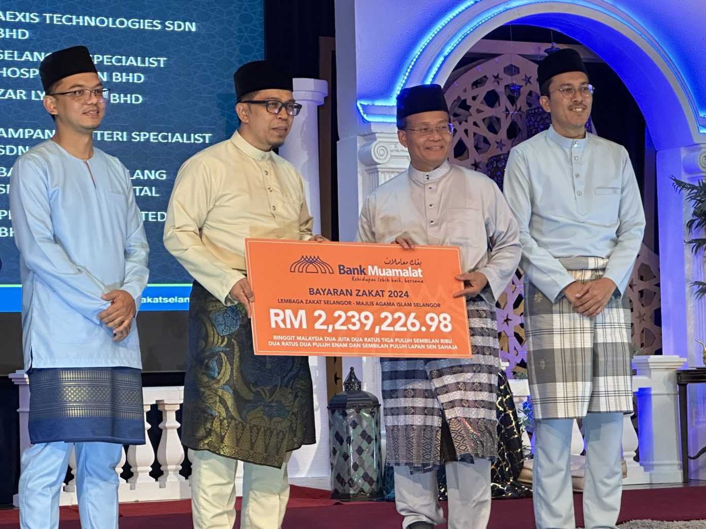 Bank Muamalat Malaysia Berhad led the list with a business zakat contribution of RM2,037,878.40, followed by Alliance Islamic Bank Berhad with RM600,000.00, Kenanga Investment Bank Berhad with RM213,549.15, and Selangor Specialist Hospital Sdn. Bhd. with RM180,621.58.